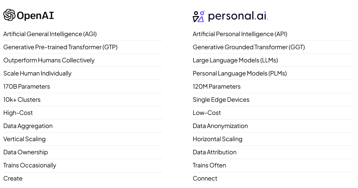 Other AIs operate on top of GPT-3 or other large-learning models, which pulls information from multiple users and sources over the internet and renders its output biased and untrustworthy. Personal AI models are built on individual personal data (aka. Memory Stack) rather than the internet of data. Its proprietary model, MODEL-1, can learn, process, and generate outputs based on personal data while GPT-3 cannot. Resulting in you having an AI that is built on how you think, not how the internet does.