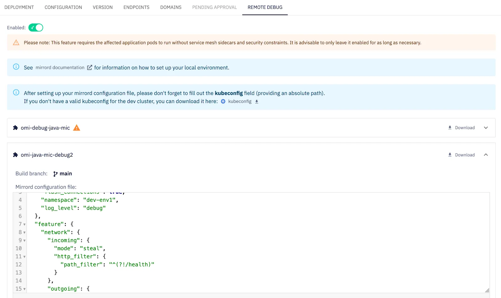 Environment-Specific Debugging: Developers can enable remote debugging on selected environments, ensuring they can inspect and troubleshoot services in real-time.